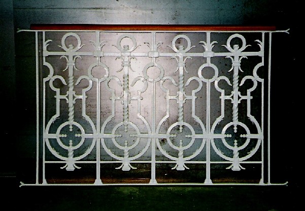 Deze gesmeden balustrade is een exacte kopie van de drie reeds bestaande balustrades in gietijzer, de getorste baren zijn in vierkant ijzer van 30mm. (open luchtschool te Kalmthout)