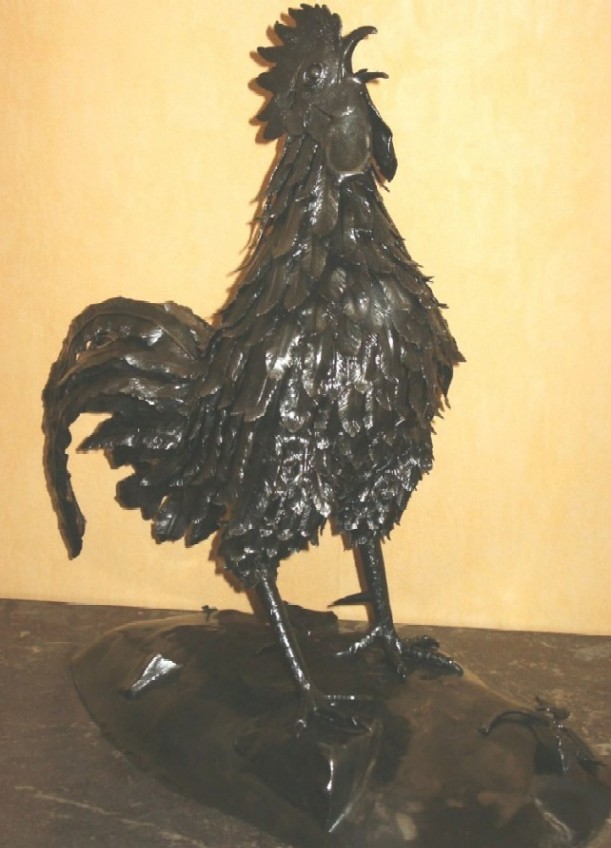 smeedijzeren Ardeense haan, +/- 55 à 60 cm. hoog, zéér gedetaillerd, +/- 300 werkuren (voor meer details zie volgende foto, daar is vergroting mogelijk tot ganse scherm)