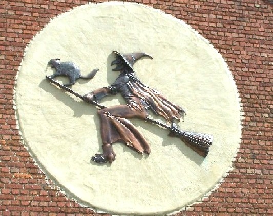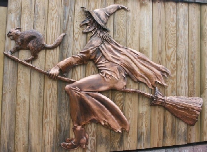 Gevel of muurversieringen in inox koper of smeedijzer, deze heks hiernaast (Heist op den berg) = +/- 2 meter x 1,50 meter