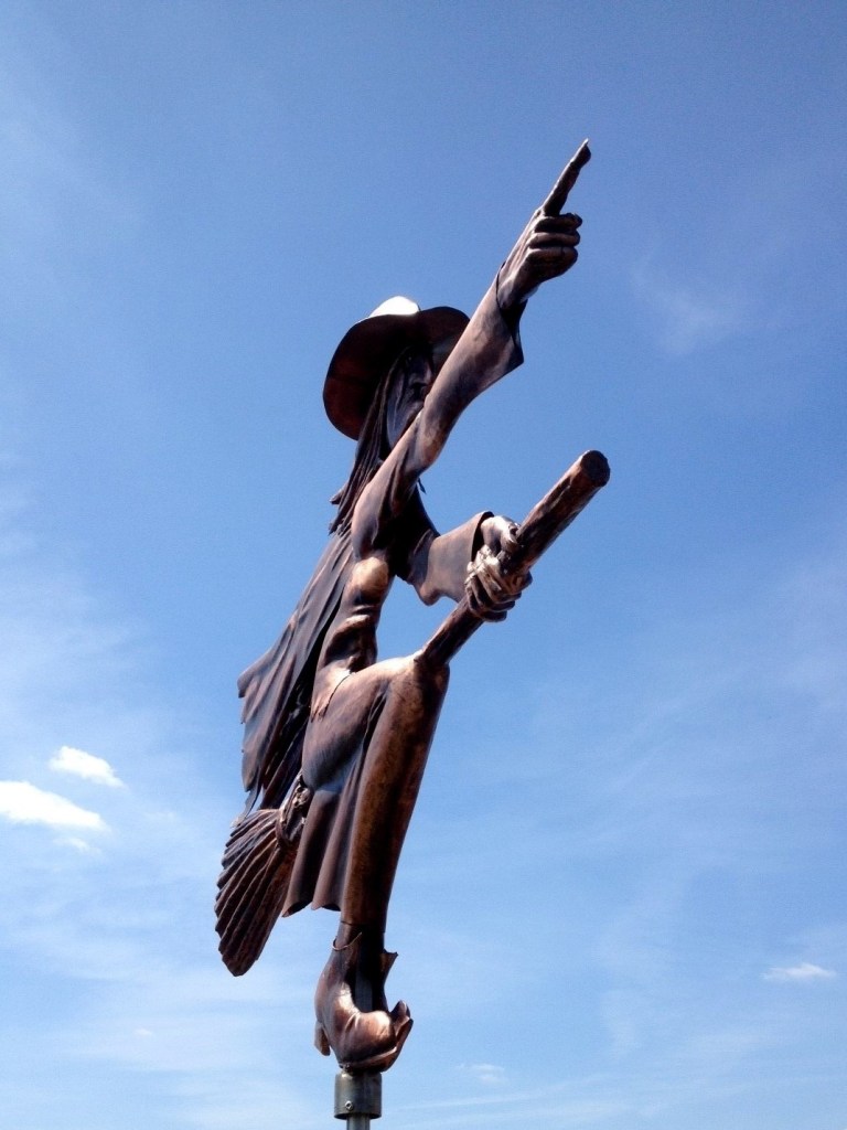 Heks in koper (+- 80 x 70 cm.) met kat en raaf. Geïnstalleerd in Alkmaar (NL)