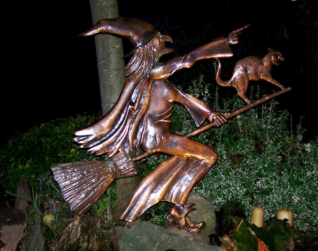 Koperen dak sculptuur van heks met vaart (vergezeld van boze kat) afmetingen +- 90 x 75 cm. afgeleverd in Kessel (Nijlen-Lier)